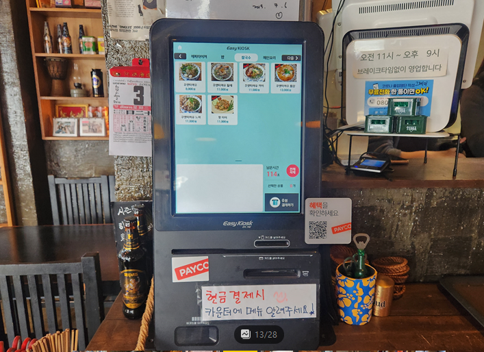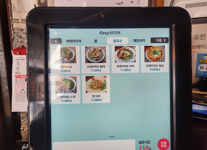 자리에 앉아있으면 주문을 받으러 오는 시스템이 아니라 키오스크로 음식을 주문해야합니다. 벽에 메뉴 설명과 함께 작은 사진이 걸려있는데요, 메뉴 이미지를 좀 더 잘 보고 싶다면 키오스크에서 메뉴 이미지를 확인해주세요.