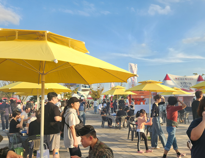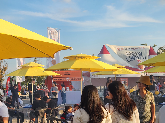 행사장 곳곳에 앉아서 먹을 수 있는 야외테이블들이 놓여져 있었고, 더위를 피할 수 있는 파라솔이 함께 비치되어 있었습니다. 아이들과 함께 축제를 즐기는 가족들이 많았고, 커플들도 데이트를 즐기며 맛있는 음식을 찾고 있었습니다.