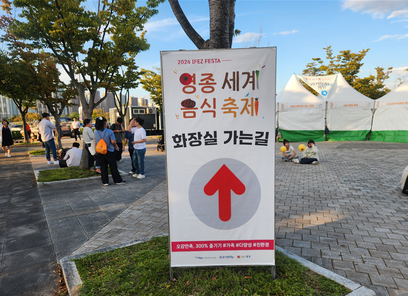 행사장 오른편에 화장실이 있습니다. 가는 도중에 화장실 가는길이라고 표지판이 있으니 찾기 어렵지는 않을 거예요. 위생상태가 어떤지 궁금해서 들어가봤는데, 생각보다 깔끔했어요. 화장실에 예민한 분들이 많을텐데, 너무 걱정하지 않으셔도 됩니다.